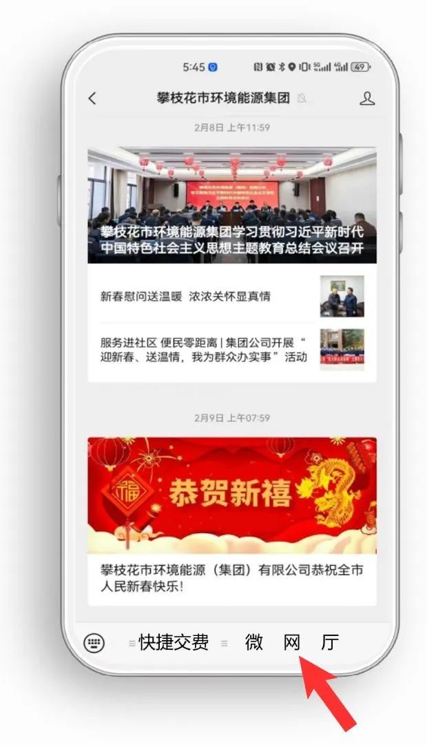 進(jìn)入攀枝花市環(huán)境能源集團(tuán)微信公眾號(hào),點(diǎn)擊屏幕下方“微網(wǎng)廳”。