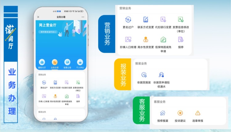 按照提示步驟,綁定用水開戶賬號(hào)后,就能輕松便捷使用“微網(wǎng)廳”各項(xiàng)服務(wù)功能。用水開戶賬號(hào)可查閱供水合同、服務(wù)短信或致電供水服務(wù)片區(qū)營業(yè)服務(wù)熱線進(jìn)行查詢。